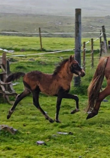 Skálmar er mjög efnilegur brúnskjóttur foli fæddur 2025