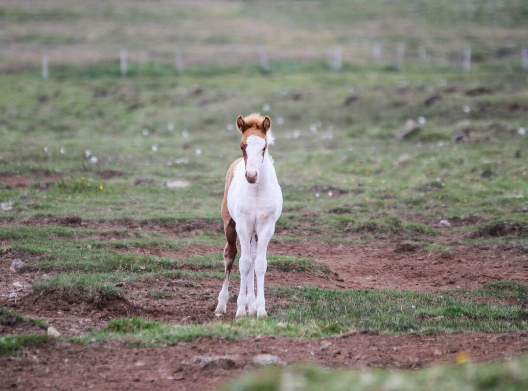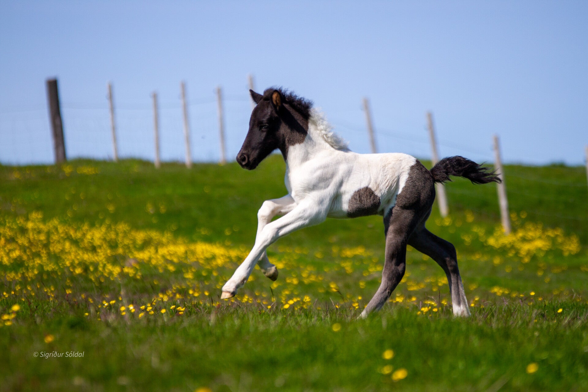 Skálmar is a promising colt born 2025. Black pinto. He show a lot of tolt.
